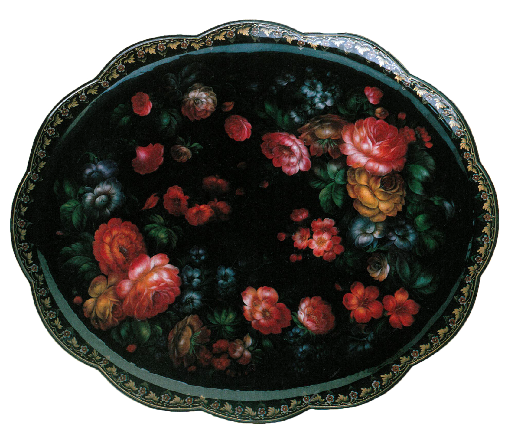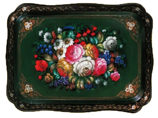 Альбом посвящен народному художественному промыслу, развитому в деревне Жостово Мытищинского района Московской области. Возник он в начале XIX в., главным образом под влиянием уральской цветочной росписи по металлу. Жостовская роспись - живопись на металлических подносах, покрытых предварительно несколькими слоями густого грунта (шпаклёвки) и масляного лака, обычно чёрного.